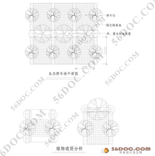 1、生态停车场设计形式多样,基本模式如下:乔木遮荫层(标志设施)——灌木隔离层(照明设施)——生态式铺装。