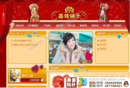 主页设计 网站主页采用静、动相结合的方式,即静态的主画面和动态的图片相结合,体现婚纱摄影网站的优雅、浪漫。静态主页方式介绍喜糖铺子,产品展示,婚纱礼服、婚庆配套等;动态运用flash动画给人们直观动感的效果。网站主页本着简单美观全面的原则,以喜庆的红色为背景,黄色相间,漂亮且动感的flash让你感受到温馨浪漫的气息。 (所有权: 毕业设计网 )