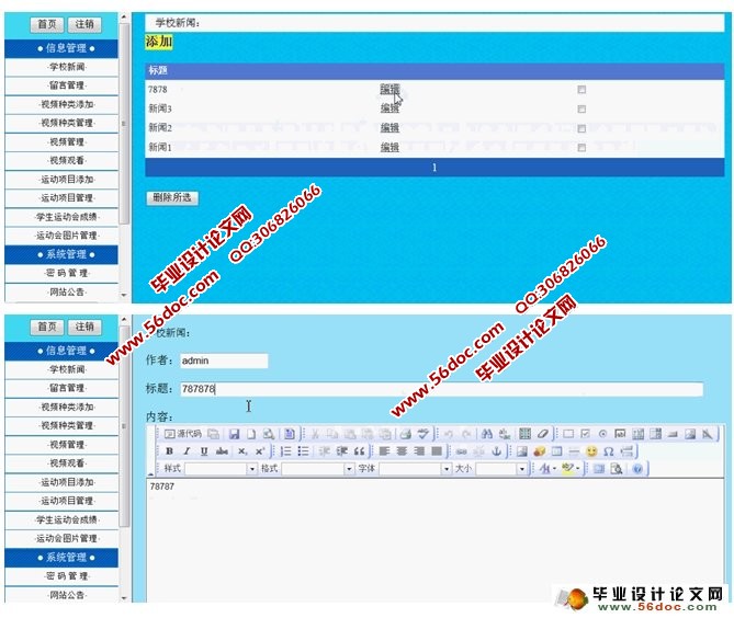 输入管理员的姓名和密码后,进入后台管理页面。后台管理页面主要包括:学校新闻管理、留言管理、运动项目管理、学生运动会成绩管理、图片管理、公告管理、密码管理、视频管理等模块。