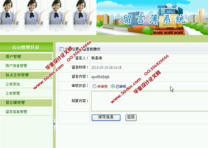 本系统采用Asp.Net语言、Microsoft Visual Studio开发工具,后端采用的是Microsoft Access 数据库来完成留言薄系统的设计与实现,通过数据操作模块能对本系统的相关信息进行各种操作,界面直观简洁。