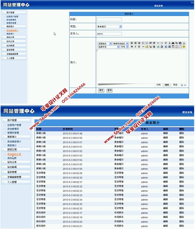 管理员可以添加对应的新闻信息,在新闻信息添加页码中输入对应的标题,发布人和内容后点击确定按钮系统自动检测数据合法性,检测通过后自动添加数据到数据库中。