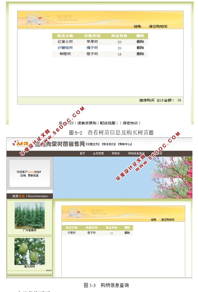 运用ASP.NET技术,基于B/S模式我开发了一个鑫鑫向荣树苗销售系统。在我的系统中,顾客可以很方便的注册成为会员,对树苗进行浏览检索,查看树苗的详细资料,然后根据各人的需要购买树苗。顾客还可以查看选中的树苗数量,及总金额。除此之外,顾客还可以查看自己的注册信息,以及修改各人信息。系统会自动为顾客生成订单,按照顾客所填写的信息提交订单并发货。顾客要记住自己的订单号,以便对订单进行查询。系统管理员则可以对现有的树苗进行添加,审查已注册的用户并删除用户,对提交的订单进行处理。