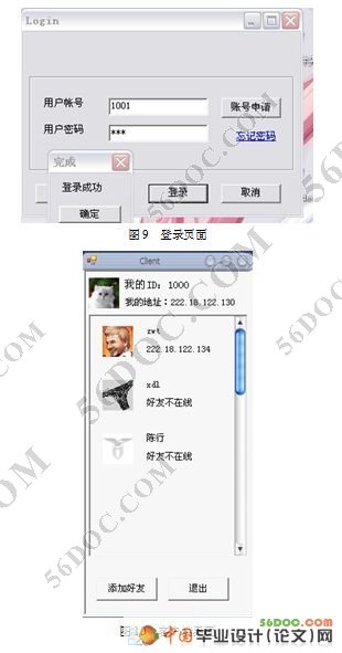 客户端即用户使用的应用程序端。用户通过该聊天软件的客户端来实现网上聊天的相关功能:注册、登录、添加好友、文字聊天、文件传输、语音聊天、视频聊天等。注册功能是提交用户相关信息以及获得一个属于自己登录该聊天软件系统的用户ID号;登录功能是实现验证用户信息与合法使用该聊天软件系统的权限;添加好友是实现用户之间好友添加的操作;添加好友成功后,就可以与好友之间开始文字聊天、文件传输、语音聊天、视频聊天等功能。
