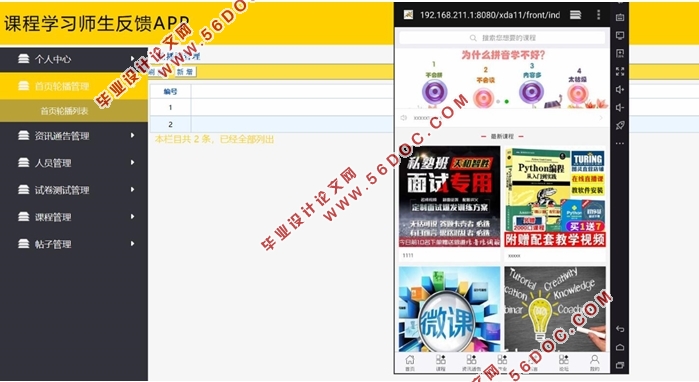 基于Android安卓的课程学习师生反馈APP的设计与实现(MySQL)(含录像) 来源:56doc.com 资料编号:5D20494 资料等级:★★★★★ %E8%B5%84%E6%96%99%E7%BC%96%E5%8F%B7%EF%BC%9A5D20494 资料以网页介绍的为准,下载后不会有水印.资料仅供学习参考之用. 密 保 惠 帮助 我要下载该资源 资料介绍 基于Android安卓的课程学习师生反馈APP的设计与实现(MySQL)(含录像)(毕业论文10000字,程序代码,MySQL数据库) 本文以Android为开发技术,实现了一个课程学习师生反馈APP。课程学习师生反馈APP的主要使用者分为管理员和用户,服务端:个人中心、轮播管理、资讯通告管理、人员管理、试卷测试管理、课程管理、帖子管理,老师:个人中心、试卷测试管理、课程管理、帖子管理、作业管理、留言交流管理,客户端:我的收藏、在线答题、我的答题记录、个人中心、我的帖子、发布帖子、密码修改等功能。通过这些功能模块的设计,基本上实现了整个课程学习师生反馈APP信息管理的过程。 开发环境 APP客户端:Eclipse 服务端:MyEclipse 数据库:MySQL 目 录 1 概述 1 1.1课题背景及意义 1 1.2 国内外研究现状 1 1.3 本课题主要工作 2 2 系统开发环境 3 2.1 java技术 3 2.2 Mysql数据库 3 2.3 B/S结构 4 2.4 Android技术 4 3 系统分析 6 3.1 可行性分析 6 3.1.1 技术可行性 6 3.1.2操作可行性 6 3.1.3 经济可行性 6 3.1.4 法律可行性 7 3.2系统流程分析 7 3.2.1系统开发流程 7 3.2.2 用户登录流程 8 3.2.3 系统操作流程 8 3.2.4 添加信息流程 9 3.2.5 修改信息流程 10 3.2.6 删除信息流程 10 3.3系统用例分析 11 3.3.1服务端用例图 11 3.3.2客户端用例图 12 4 系统设计 13 4.1 系统概述 13 4.2 系统结构设计 13 4.3数据库设计 14 4.3.1 数据库设计原则 14 4.3.2 数据库实体 14 4.3.3 数据库表设计 17 5系统界面实现 20 5.1 登录 20 5.2 服务端功能模块 20 5.2.1 轮播管理 20 5.2.2 资讯通告管理 21 5.2.3 学生管理 21 5.2.4 试卷测试管理 22 5.2.5 课程管理 22 5.2.6 帖子管理管理 22 5.3 老师功能模块 23 5.3.1 试题管理 23 5.3.2 作业管理 23 5.3.3 留言管理 24 5.4 客户端功能模块 24 5.4.1 首页功能图 24 5.4.2 作业提交 25 5.4.3 帖子发布 26 6系统测试 27 6.1系统测试的意义 27 6.2 测试方法 28 6.3测试分析 28 结 论 29 致 谢 30 参考文献 31