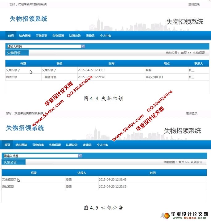 5、失物信息模块:本模块包括失物信息上传和失物认领信息记录。