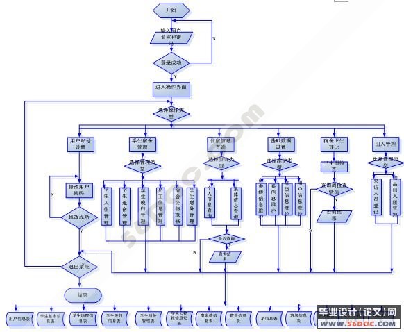 通过以上对系统基本功能的需求分析,我将高等院校学生宿舍信息管理系统总体上分为分为个七个大的模块:用户帐号模块、宿舍管理模块、学生信息查询模块、卫生评比模块、出入登记模块、基础数据模块、帮助模块。