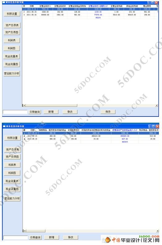 The systems, through PowerBuilder 9.0 integrates the environment, establishes Adaptive Server AnyWhere database. The analyticl system of this financial information mainly carries on functions such as the arrangement and analyzing the operating capacity,etc. to balance sheet, profit flow table, cash flow statement. Users enter the system after verifying through the identity, can add the project of the report form, revise, delete, inquire, and carry on the analysis to the operating capacity according to these financial data.