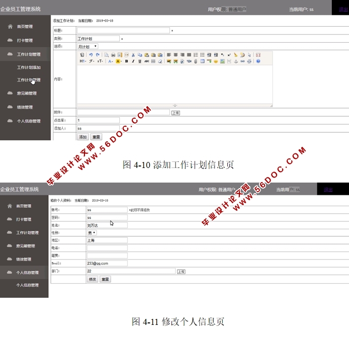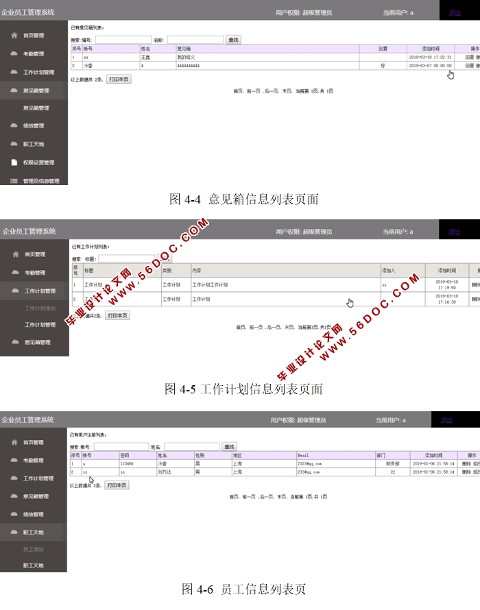 企业员工管理系统的设计与实现(PHP,MySQL)(含录像) 来源:56doc.com 资料编号:5D19150 资料等级:★★★★★ %E8%B5%84%E6%96%99%E7%BC%96%E5%8F%B7%EF%BC%9A5D19150 资料以网页介绍的为准,下载后不会有水印.资料仅供学习参考之用. 密 保 惠 帮助 我要下载该资源 资料介绍 企业员工管理系统的设计与实现(PHP,MySQL)(含录像)(毕业论文10000字,程序代码,MySQL数据库) 本系统实现的是企业员工管理系统,系统分为两种用户,包括管理员和员工两类用户,他们各自拥有不同的权限操作。本文所设计的功能模块主要实现了用户登录、考勤管理、工作计划管理、意见箱管理、绩效管理及职工天地、权限设置管理。 超级管理员拥有最高权限,可以对整个系统各功能模块进行添加、搜索、查看、编辑或删除等功能操作,包括普通管理员信息更新和维护,员工用户可在线登录后,执行相应权限功能操作。员工除了对个人工作计划和意见箱信息、绩效信息的添加、查看、编辑或删除等操作,其它还可修改个人信息。 具体功能描述如下: 管理员: 1、 管理员登录:实现管理员登录后台功能,登录需输入正确用户名和密码、身份。 同样,员工用户也具有和管理员一样的登录流程。身份不同管理权限不同。登录密码忘记可重置。 2、 考勤管理:实现管理员对员工考勤信息的搜索、查看、添加、编辑或删除、下载、打印等功能操作。 3、 工作计划管理:实现管理员对员工工作计划信息的添加、搜索、查看或删除、打印等功能操作。 4、 意见箱管理:实现管理员对意见箱信息的搜索查看、回复或删除、打印操作。 5、 绩效管理:实现管理员对绩效信息的搜索、查看、添加、编辑或删除、打印等功能操作。 6、 职工天地管理:实现管理员对职工天地信息的添加、搜索、查看或删除、打印等功能操作。 7、 权限设置管理:管理员可进行数据备份,查看操作日志或打印。 8、 管理员管理:超级管理员对普通管理员信息的添加、查看或删除。 员工用户: 1、登录:员工登录系统功能实现,登录流程同管理员操作流程一致。 2、打卡管理:员工用户可在线添加、搜索、查看、编辑或删除个人打卡信息。 3、工作计划管理:员工对个人工作计划信息添加、搜索、查看、修改或删除等操作。 4、意见箱管理:员工可添加、搜索、查看、打印意见箱信息等操作。 5、绩效管理:员工可搜索、查看、打印绩效信息等操作。 6、个人信息管理:员工用户可修改个人信息功能。 目 录 摘 要 2 Abstract 3 目 录 5 第1章 引言 7 1.1 课题背景及意义 7 1.2 系统研究现状 8 第2章 系统需求分析 9 2.1 可行性分析 9 2.1.1 技术可行性 9 2.1.2 经济可行性 9 2.1.3 操作可行性 9 2.2 技术需求分析 10 2.2.1 PHP技术介绍 10 2.2.2 Zend Studio 13简介 11 2.2.3 B/S框架 11 2.2.4 MYSQL数据库 11 第3章 系统总体设计 13 3.1 系统开发环境 13 3.2 系统设计目标 13 3.3 系统功能结构图设计 13 3.4 系统流程图设计 15 3.5 系统数据库的设计 17 3.5.1 数据库实体设计 17 3.5.2 数据表设计 19 第4章 系统的详细设计与实现 21 4.1 管理员登录界面 21 4.2 考勤信息列表页 21 4.3 绩效信息添加页面 22 4.4 意见箱信息列表页面 22 4.5 工作计划信息列表页 22 4.6 员工信息列表页 23 4.7 添加员工信息页 23 4.8 添加打卡信息页 24 4.9 在线意见箱信息页 24 4.10 添加工作计划信息页 24 4.11 修改个人信息页 25 第5章 应用与测试 26 5.1 系统测试的定义 26 5.2 系统测试的目的 26 5.3 测试用例方法 26 5.4 测试结果 28 结 论 1 参考文献 2 致 谢 3