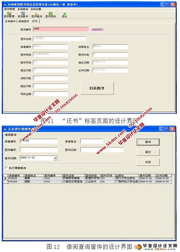 还书部分:首先要进行图书信息的确认,注意在判断该图书是否借出时,同借出流程做相反的处理,只有借出去的图书才能进行还书,同时在进行还书的操作时,除了要更新借阅信息中的内容外,还要更新该图书在数据库中的状态即设置其状态为没有借出,以方面其他读者借阅。