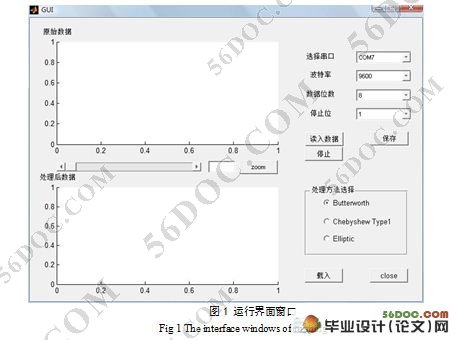 系统的界面包括了原始数据曲线显示区,串口选择下拉菜单,波特率选择下拉菜单,数据位数、停止位设置下拉菜单;原始数据读入按钮、停止按钮,数据保存按钮;调节显示区比例的滚动条,局部放大按钮;处理后数据显示区,处理方法选择按钮组,载入处理后数据按钮和退出按钮。