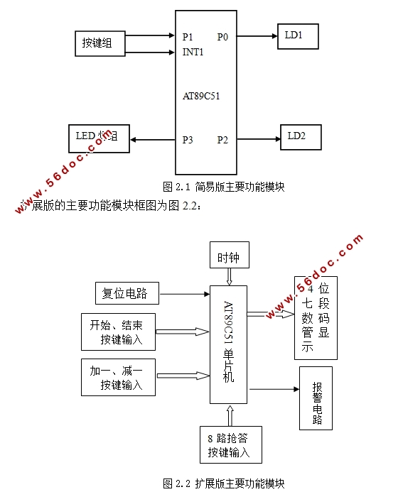 The design of the main use of the AT89C51 microcontroller timer / counter timer and counter principle, using AT89C51 microcontroller and its peripheral interface designed to achieve a Responder, the entire system can perform the function of the countdown, using 7-segment LED display countdown time and accurately contestant number.To switch the input to the speaker output sound and the LED display. Which were designed with simple and extended versions. Easy version, answer number is 5, answer time is fixed at nine seconds, someone will answer or end countdown red tips, green tips Responder winner will be a few numbers, LED will display its number; in the extended version, the answer is number eight, before starting to answer in answer to be invalid, answer time can be set between 1-99 seconds, then 10 seconds to answer in a successful response will be provided time to be able to show which players answer success or answer a foul, the function of which has voice prompts.