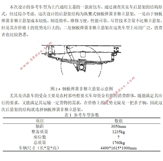 本次设计的参考车型为上汽通用五菱的一款面包车,通过调查其实车后悬架的结构形式,经过综合考虑,这次设计的后悬架结构为纵置式钢板弹簧非独立悬架。一是由于钢板弹簧非独立悬架成本较低,制造简单,维修方便,性能可靠,尽管技术含量不比独立悬架,但是其在价格上的优势是巨大的;二是钢板弹簧非独立悬架在这类车型上应用广泛,消费者也比较熟悉。