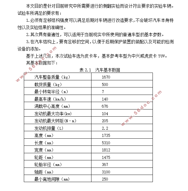 本文主要是以侧翻实验的要求为主要目标,进而以威虎TUV皮卡为参考原型设计出可以满足侧翻实验要求的试验车。侧翻事故作为汽车事故中危险性较大的事故,需要对其产生的状态以及产生的原因进行实验探究,本此设计的试验车将应用于此,以期可以在试验中提供可靠的实验数据。