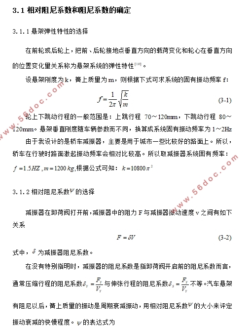 本次设计的是双作用筒式减震器。先对相对阻尼进行确定,之后对缸筒、活塞杆、导向座和活塞的宽度以及各阀系进行设计计算,并对活塞杆的强度和稳定性进行校核,最后用Pro/E对减震器的主要零件进行三维建模。