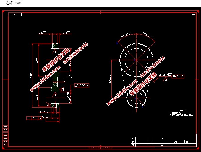 题目给出的零件是连杆。连杆主要是起传动作用,一个设备的正常运行离不开轴,轴承等一些传动零件和传动机构,同样,连杆的作用是连接在两个零件之间,起到连接的作用。故连杆零件的加工精度和表面光洁度直接影响着传动的精度和效率,可以说,一个加工精度高的连杆与加工精度的低的连杆相比,其传动效果很明显。