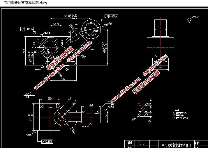 2、 圆柱中间需要加工 的通孔并倒1×45°倒角。同时零件图要求 的通孔和 通孔的工艺性要求较高,位置精度要求距离56mm,同时它们的中轴线与底平面的平行度要保证为0.05;