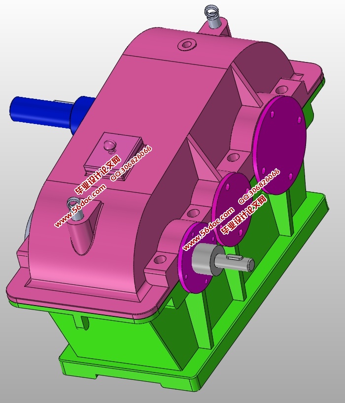 采用三相电机与二大二小齿轮传动的组合,一组为直齿圆柱齿轮,一组为斜齿圆柱齿轮传动,即可满足传动比要求。