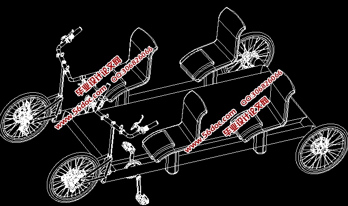 一般的观光自行车都是单人骑行,有时外出游玩时一辆观光自行车需载多人,在携带儿童的情况下,不能骑多辆观光自行车出行,因些本次设计的前后四人运动休闲旅游观光观光自行车,可载成人出行以及放置物品。