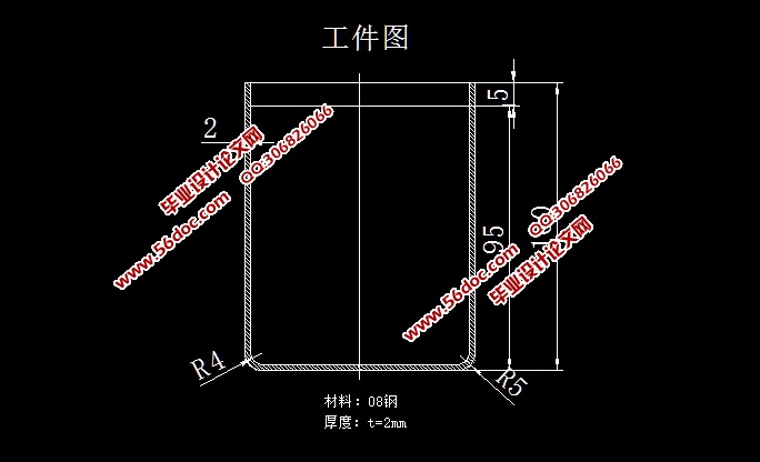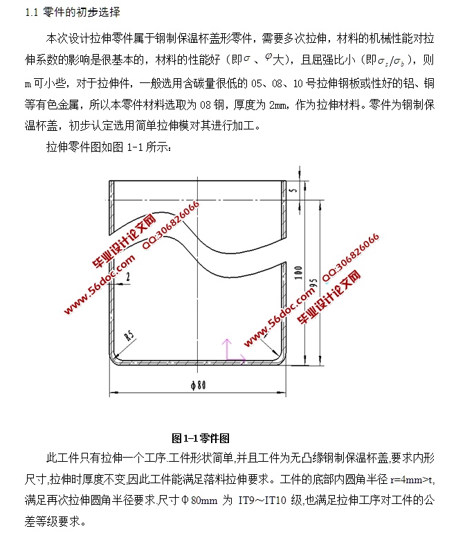 此工件只有拉伸一个工序.工件形状简单,并且工件为无凸缘钢制保温杯盖,要求内形尺寸,拉伸时厚度不变,因此工件能满足落料拉伸要求。工件的底部内圆角半径r=4mm>t,满足再次拉伸圆角半径要求.尺寸φ80mm为IT9~IT10级,也满足拉伸工序对工件的公差等级要求。