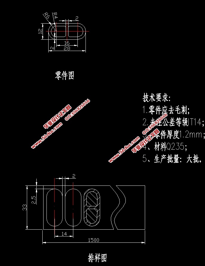冲裁件材质为:Q235,零件厚度为1.2mm,属于碳素结构钢,具有良好的冲压性能,适用于要求较高的零件。