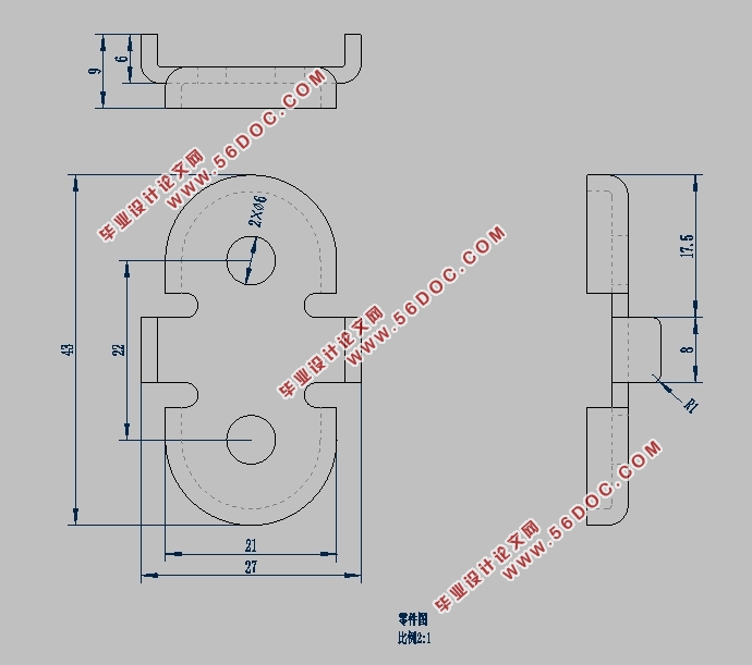 该零件是一个钣金件,有对称的外圆翻边和弯曲并且有两个直径为6mm的孔,零件较薄,在我们这里采用级进模成形。该零件展开后外轮廓较为复杂,要求的尺寸精度偏高[2]。一般冲裁件的经济公差等级不能高于IT11,落料的公差等级最好要低于IT10,冲孔的公差等级最好要低于IT9,因此可由参考文献[1]表4-1查得该制件的落料公差和冲孔公差,由参考文献[1]表4-2查得孔的中心距公差,并且由于冲孔的精度要求较高,因此可用高精度的冲孔公差等级,由于冲裁件没有断面粗糙度的要求,所以我们不必考虑冲压断面的粗糙度要求,但要保证制件边缘能出现较大的飞边和毛刺。[1]