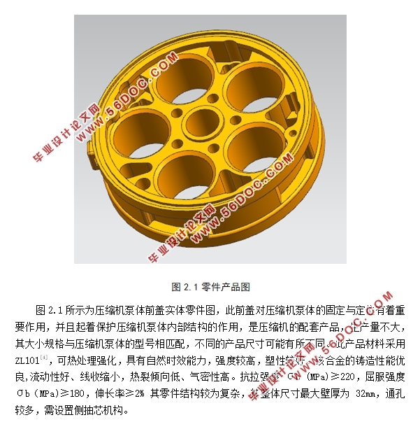 所示为压缩机泵体前盖实体零件图,此前盖对压缩机泵体的固定与定位有着重要作用,并且起着保护压缩机泵体内部结构的作用,是压缩机的配套产品,生产量不大,其大小规格与压缩机泵体的型号相匹配,不同的产品尺寸可能有所不同。此产品材料采用ZL101[4],可热处理强化,具有自然时效能力,强度较高,塑性较好。该合金的铸造性能优良,流动性好、线收缩小,热裂倾向低、气密性高。抗拉强度 σb (MPa)≥220,屈服强度σb(MPa)≥180,伸长率≥2% 其零件结构较为复杂,其整体尺寸最大壁厚为32mm,通孔较多,需设置侧抽芯机构。