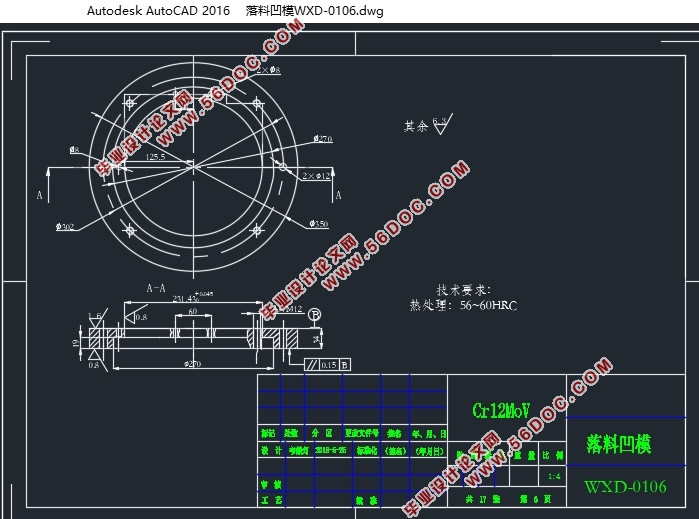 本文对给定的汽车零部件进行合理的结构和工艺分析,通过初步计算,分析确定成形方案,查阅相关资料书进行工艺计算,完成落料-拉深复合模、二次拉深模、整形模、冲孔切边模等5副模具主要工作零件的设计,并借助Pro/E和AutoCAD计算机辅助软件进行零件的绘制并完成装配图。