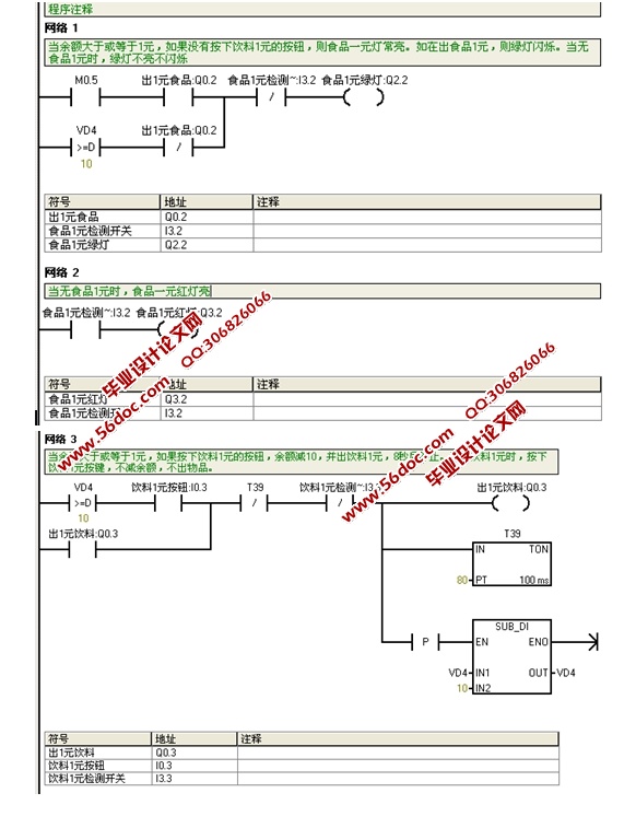 本文简要介绍了课题研究的意义,自动售货机在国内外的研究动态,主要设计的是基于西门子S7-200 系列PLC构成的自动售货机控制系统,包括自动售货机控制系统硬件设计,软件的设计,I/O分配,系统控制流程图,PLC梯形图程序的编写和系统梯形图的调试仿真。