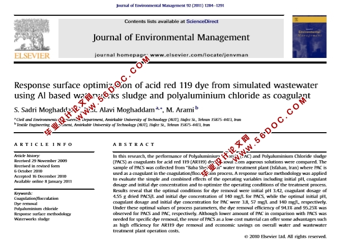 自来水厂的铝基污泥和聚合氯化铝作混凝剂对模拟废水中酸性红119染料的响应面优化(中文6000字,英文PDF)