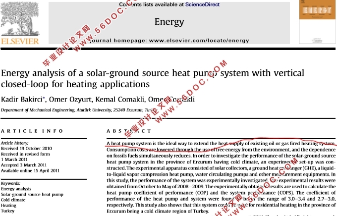 关键词:能耗分析,太阳能-地源热泵,寒冷气候,供暖,土耳其