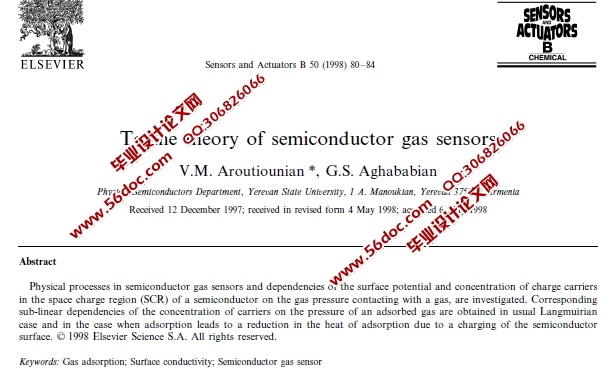 半导体气体传感器理论(含外文出处) 来源:56doc.com 资料编号:5D16312 资料等级:★★★★★ %E8%B5%84%E6%96%99%E7%BC%96%E5%8F%B7%EF%BC%9A5D16312 资料以网页介绍的为准,下载后不会有水印.资料仅供学习参考之用. 密 保 惠 帮助 我要下载该资源 资料介绍 半导体气体传感器理论(含外文出处)(中文3500字,英文PDF) 摘要 半导体气体传感器的表面电势和电荷载流子浓度的依赖关系的物理过程是在空间电荷区(SCR)的半导体气体压力与气体的接触面上进行研究的。同时也研究了在Langmuirian情况下获得的吸附气体压力表面与载流子浓度的次线性依赖关系和由于半导体表面充电而导致的热吸附减少。© 1998 S.A.爱思唯尔科学版权所有。 关键词:气体吸附;表面导电性;半导体气体传感器