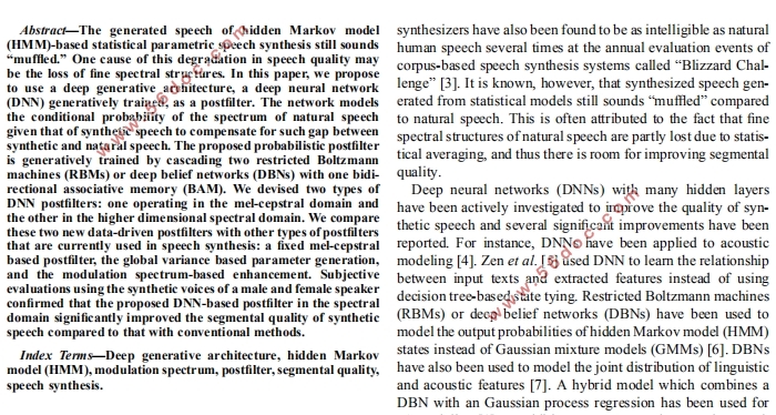 摘要—基于隐马尔可夫模型(HMM)的统计参数语音合成听起来仍是“闷”的。导致语音质量下降的一个原因可能是精细频谱结构的损失。在本文中,我们提出使用一个由深度神经网络(DNN)训练生成的深度生成架构来作为后置滤波器。网络模拟自然语音频谱的条件概率,给出合成语音频谱的条件概率来补偿合成与自然语音之间的差距。所提出的概率后置滤波器通过双向联想记忆(BAM)来级联两个限制玻尔兹曼机(RBM)或深度信念网络(DBN)来进行生成训练。我们设计了两种类型的DNN后置滤波器:一种在梅尔倒频谱域中操作,另一种在较高维度的频域中操作。我们将这两种新型的数据驱动后置滤波器与目前在语音合成中使用的其他类型的后置过滤器进行比较:基于固定的梅尔倒频谱的后置滤波器,基于全局方差的参数生成和基于调制频谱的增强。使用男性和女性演讲者的合成语音进行主观评估证实了所提出的基于DNN的后置滤波器在频域中与常规方法相比,显着提高了合成语音的分段质量。