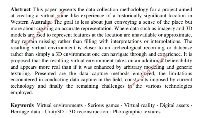 关键词:虚拟环境,严肃游戏,虚拟现实,数字资产,遗产数据,Unity3D,3D重建,照片纹理