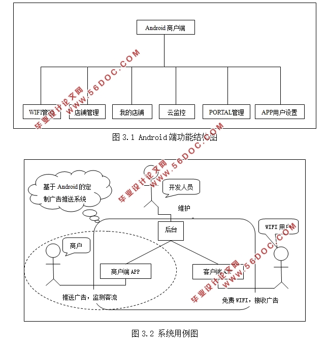 2, the system of the Android business side of the demand analysis and the overall design, describes the implementation process of the system. The system is for shops to discuss customized operating platform, business users can through which to achieve the following functions: real-time view their shops in the traffic situation; to store user for targeted advertising push; set up their own store information; set the edit push send advertising information; app with user settings.