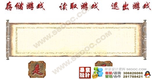 游戏的详细设计 人物走动: A. 人物特效:人物(主人公)的走动分为四个方向:上下左右,每个方向上分别对应3幅图片。当检测到玩家的按键信息时,会根据特定的按键事件调用相应的走动模块。当人物到达特定地点时,会触发一些特效。如:到达树下时,会有阴影效果 B. 方向控制:在本游戏中,人物的走动方向,设定为斜45度夹角。根据检测玩家按下的方向控制键,来判断调用相应方向的人物走动图片。 C. 碰撞检测:人物走动的碰撞检测,是根据判定相应数组对应的特定值来实现的。每一个游戏场景都对应各自的数组,在数组中记录了地图中的碰撞坐标点以及特效点。 人物对话: A. 对话内容编辑:根据特定的场景,编写不同的对话内容。将对话内容写入各自的文件。 B. 对话框效果:对话框,是以图片的形式给出的。对话框的显示过程即调用对应图片的过程 C. 对话触发事件:当检测到人物的当前坐标位置,处于预先设定好的对话区域内时,调用对话框显示模块。对话内容的显示过程即读文件的过程。 游戏道具: A. 道具分布:游戏中的道具,均在地图的第一次加载是随机分布的。 B. 道具拾取:检测主人公的当前位置,如果到达道具分布的触发点时,触发相应的拾取模块。 人物属性: A. 任务完成升级:游戏设定玩家必须要做完各个时期的任务时,才能继续向下玩。 B. 道具增加经验:随着主人公所拾取道具的增加,根据其道具的属性值,取得相应的经验。 C. 金钱属性累加:随着主人公所拾取道具的增加,根据其道具的属性值,增加相应的金钱值。 进度设定: A. 存储进度: 当玩家要中途退出时,可以按下ESC键,找到相关设置菜单,进行当前进度的存储。 B. 读取进度: 如果玩家要接着进行上次存储的进度继续游戏时,可以按下ESC,找到相关的菜单,进行读取进度。 场景切换: A. 地图加载事件:当检测到人物触发了地图切换事件时,此事件触发。根据触发点,确定加载地图的ID,保存人物当前状态,重画地图和人物。 B. 切换区域设置:每一个场景的转换处,都会有一个场景转换区域。当人物一旦进这个区域,便调用相应的地图加载模块。 C. 人物位置检测:在人物的每一次移动之前,都会调用一次位置检测模块。用于取得当前坐标值,再与对应数组中的值进行检索,判断下一步的触发调用模块。 人物打斗: A. 打斗控制:在打斗模块中,人物的动作,是依照玩家的按键信息来控制的。如:当玩家按下Enter键时,触发相应的打斗动作模块。 B. 技能特效:在本游戏中,对主人公(沉香)和NPC(二郎神)都设定了各自的打斗技能。 C. 数据增减:根据人物的打斗结果,来判定其属性的增减。 游戏任务: A. 游戏对话任务:通过与NPC对话完成剧情任务。 B. 道具拾取任务:通过拾取游戏的道具,完成剧情任务。 C. 人物打斗任务:通过与”二郎神”的打斗,完成剧情任务。(毕业设计网 )