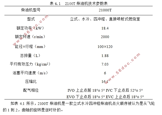 如表4.1所示,2100T柴油机是一款立式水冷四冲程柴油机点火顺序被认为是从飞轮的1到2,曲轴的旋转是逆时针的。